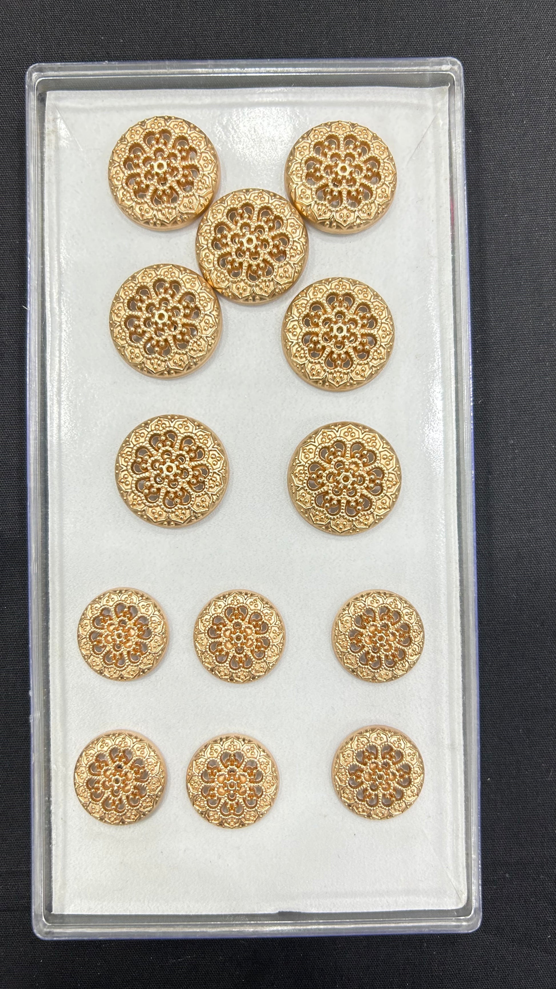 Engraved rose gold Sherwani buttons are a sophisticated and elegant choice for men’s traditional wear. The subtle warmth of rose gold, combined with intricate engraving, creates a refined and luxurious aesthetic. These buttons are typically designed with detailed patterns or motifs, such as floral or geometric shapes, adding texture and depth. The soft yet striking hue of rose gold complements a variety of Sherwani fabrics and colors, making them a popular choice for weddings and formal occasions. Their unique combination of elegance and craftsmanship enhances the overall look, offering a modern twist on classic designs.