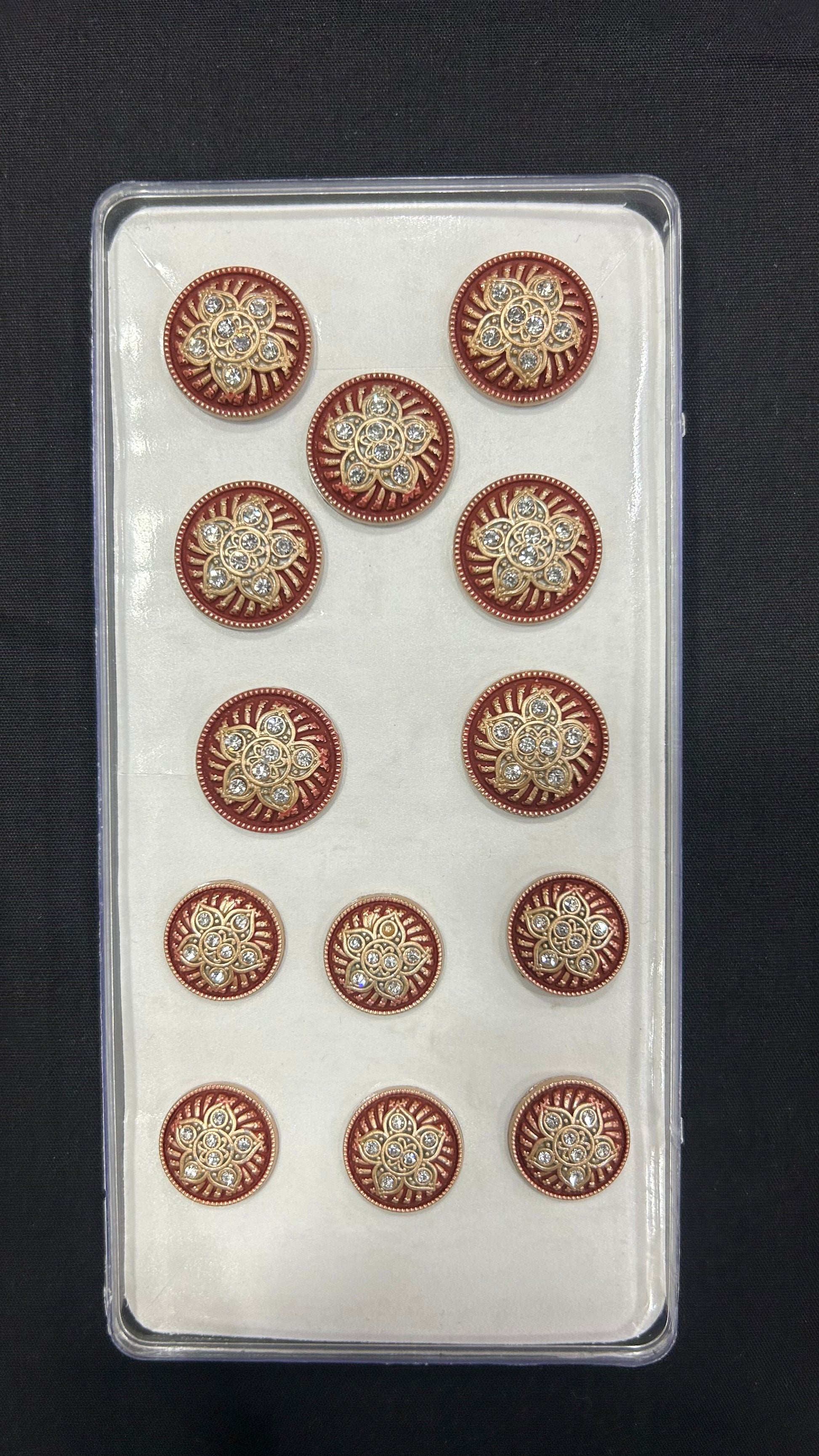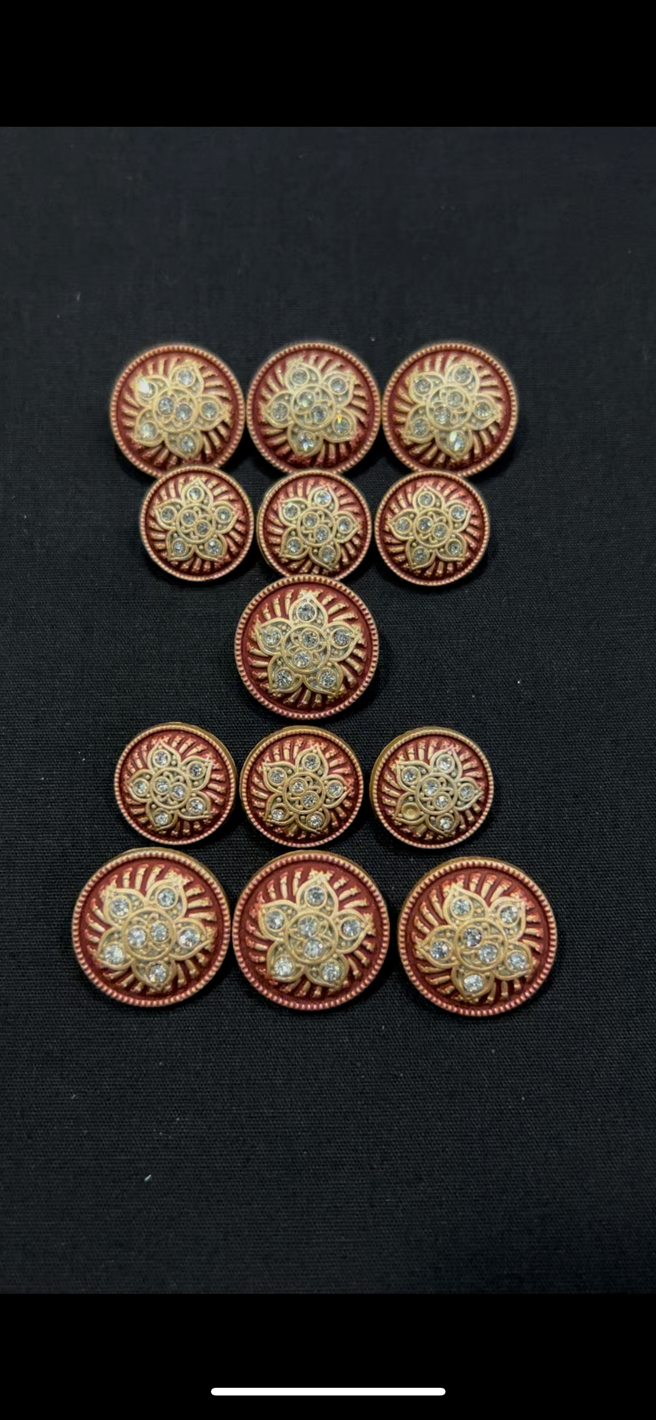 White-stoned red Meenakari sherwani buttons are traditional decorative pieces featuring intricate red enamel work paired with white stones. These handcrafted buttons are commonly used to adorn sherwanis, adding elegance and sophistication. Their vibrant red hue contrasts beautifully with the shimmer of white stones, making them ideal for weddings or festive occasions. Perfect for enhancing the regal look of Indian ethnic wear, these buttons reflect heritage and artistry.